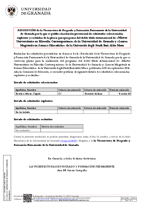 Convocatoria de plazas doble titulación. Máster en Filosofía Contemporánea: I BARI01 Resolución provisional plazas Máster en Filosofía contemporánea: I BARI01 Resolución definitiva plazas Máster en Filosofía contemporánea: I BARI01