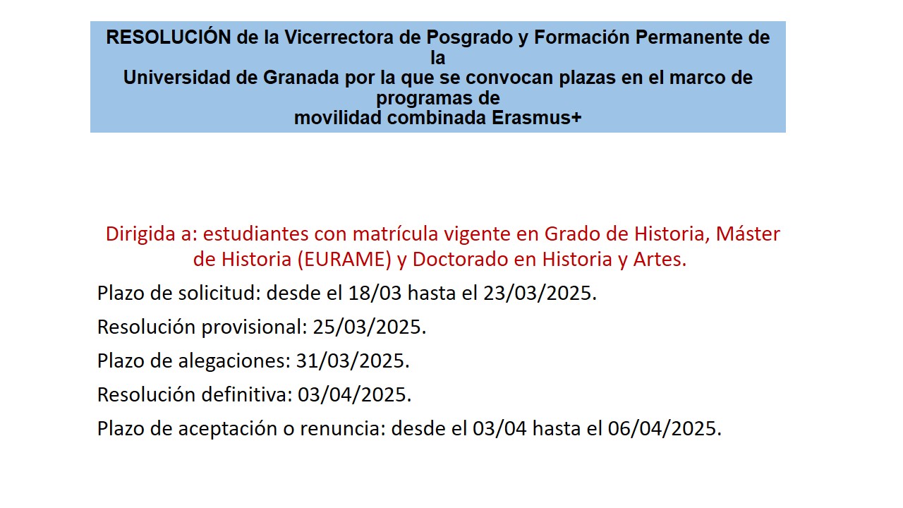 RESOLUCIÓN de la Vicerrectora de Posgrado y Formación Permanente de la Universidad de Granada por la que se convocan plazas en el marco de programas de movilidad combinada Erasmus+ Dirigida a: estudiantes con matrícula vigente en Grado de Historia, Máster