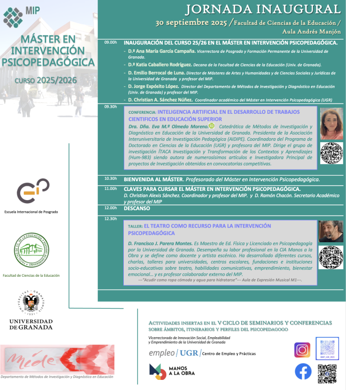 El próximo lunes 29 de septiembre (de 09.00h a 14.00h) se ha actualizado el horario del curso (disponible aquí) y el martes día 30 tendremos la Jornada Inaugural (Aula Andrés Manjón a las 09.00h- Facultad de Ciencias de la Educación). Aquí se adjunta el programa. Recuerda traer ropa cómoda!!